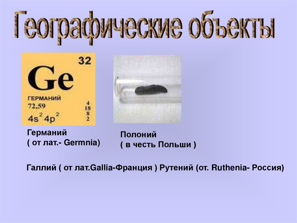 Галлий ( от лат.Gallia-Франция ) Рутений (от. Ruthenia- Россия)