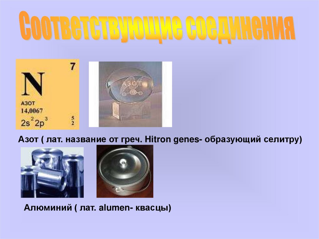 Азот ( лат. название от греч. Hitron genes- образующий селитру)Алюминий ( лат. alumen- квасцы)