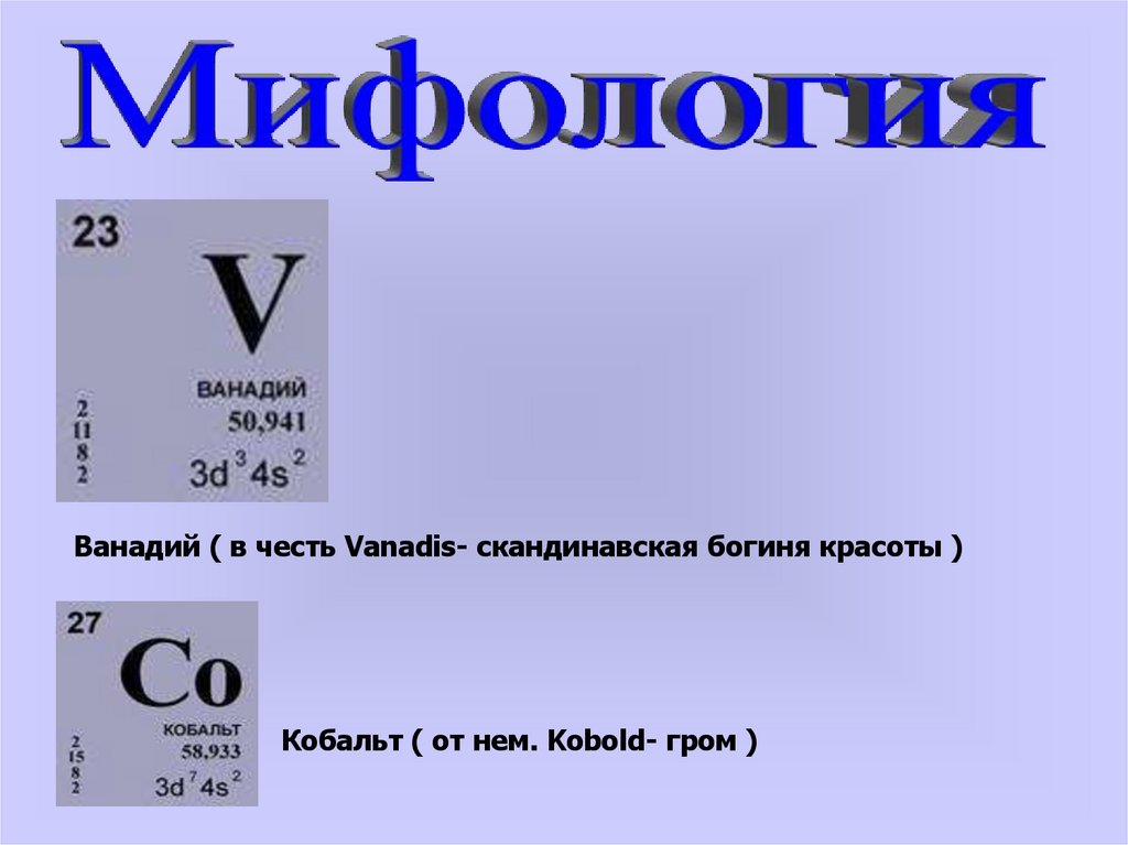 Ванадий ( в честь Vanadis- скандинавская богиня красоты )Кобальт ( от нем. Kobold- гром )