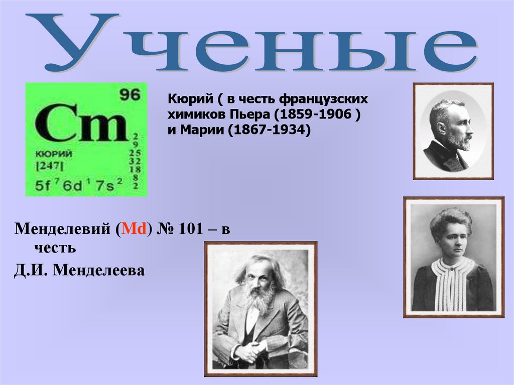 Кюрий ( в честь французскиххимиков Пьера (1859-1906 )
