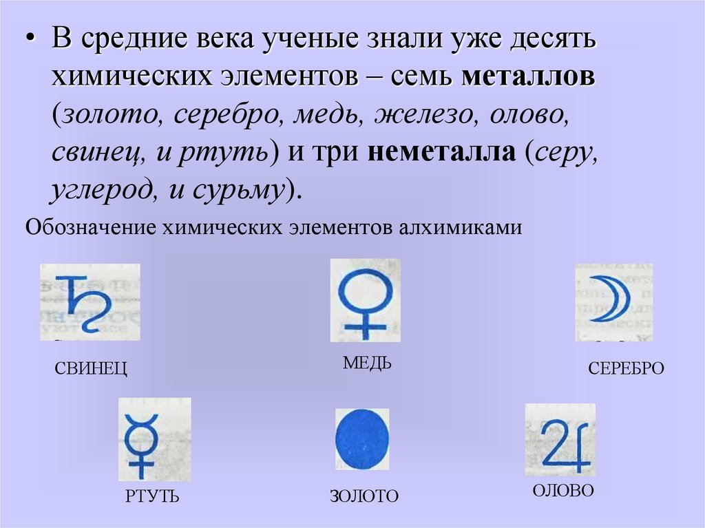• В средние века ученые знали уже десятьхимических элементов – семь металлов