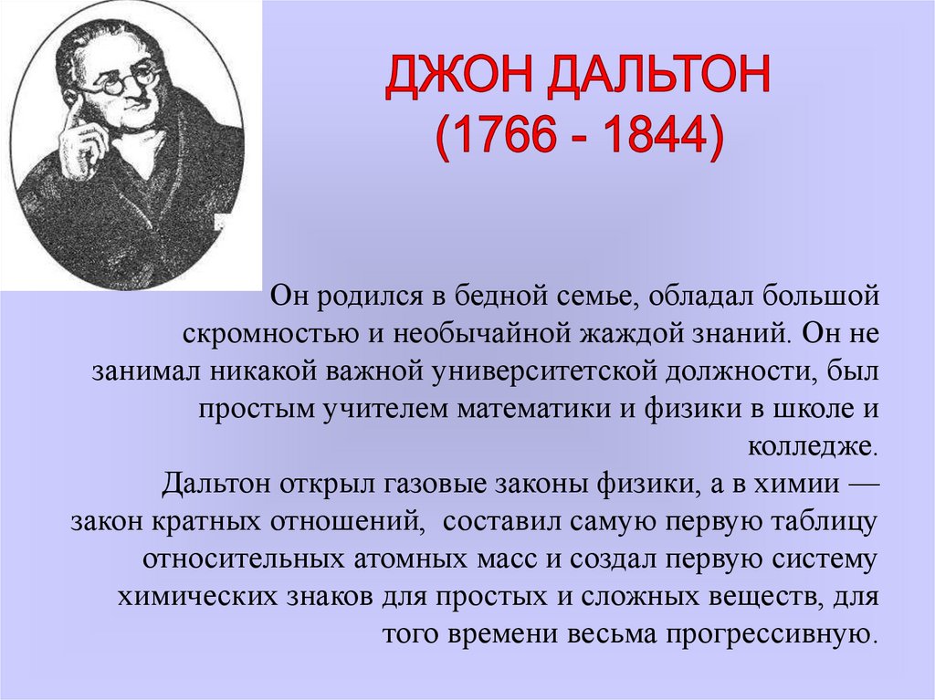Дальтон открыл газовые законы физики, а в химии —