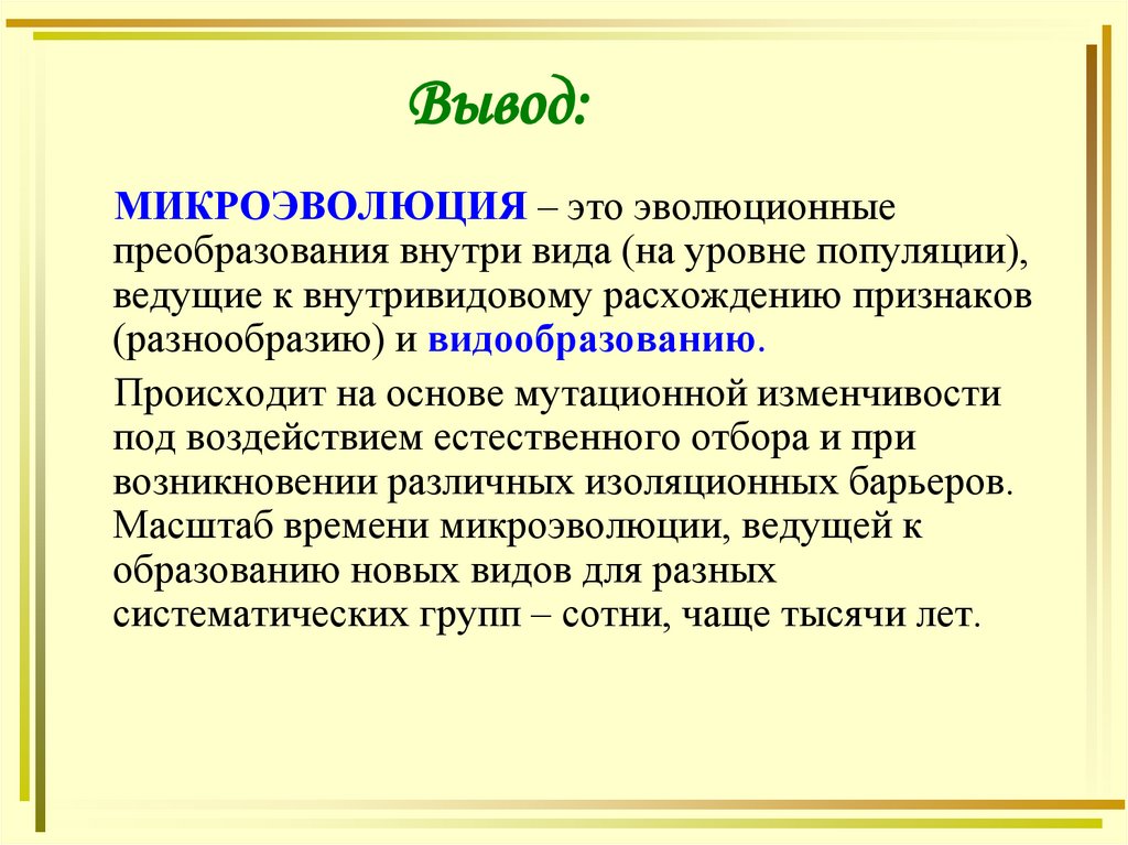 Вывод:МИКРОЭВОЛЮЦИЯ – это эволюционные
