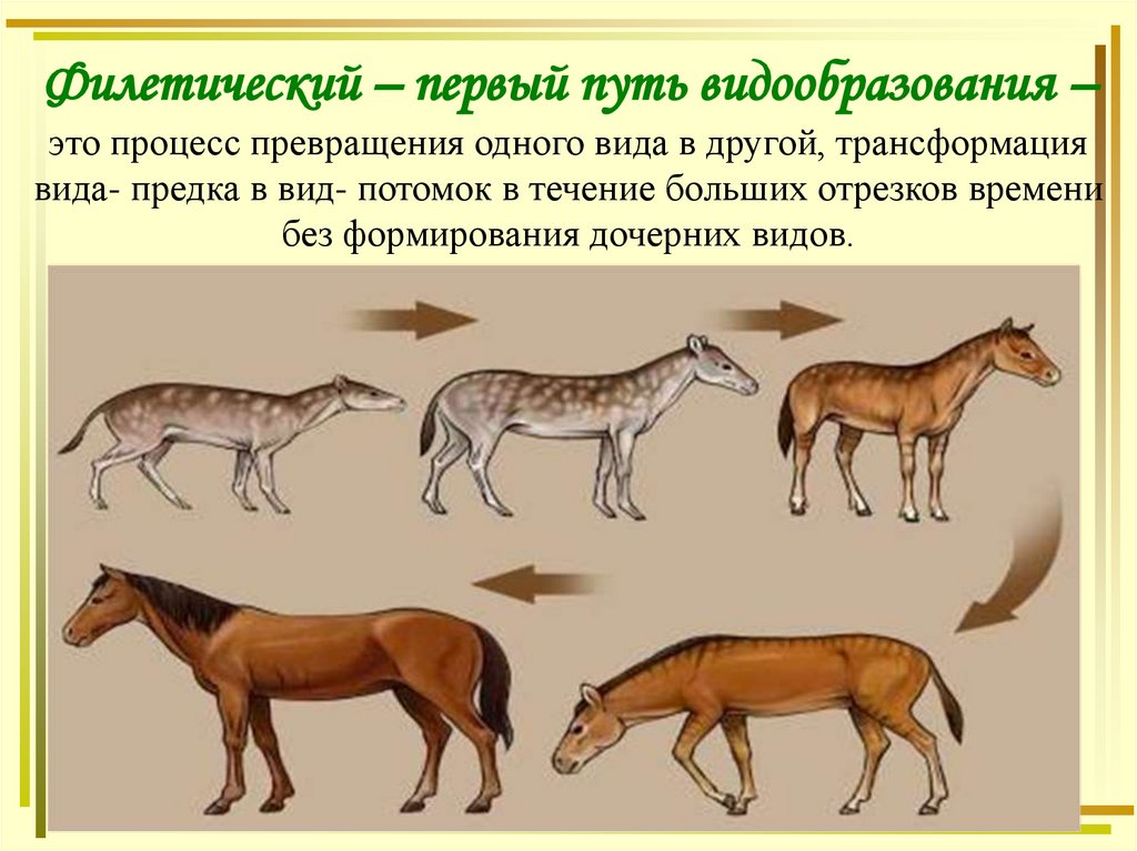 Филетический – первый путь видообразования –это процесс превращения одного вида в другой, трансформация