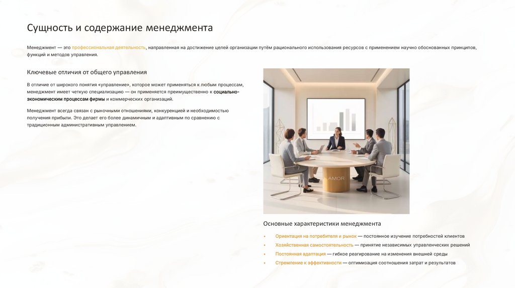менеджмент имеет четкую специализацию — он применяется преимущественно к социальноэкономическим процессам фирмы и коммерческих организаций.