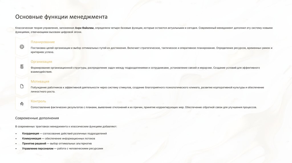 Основные функции менеджментаКлассическая теория управления, заложенная Анри Файолем, определила четыре базовые функции, которые остаются актуальными и сегодня. Современный менеджмент дополнил эту систему новыми