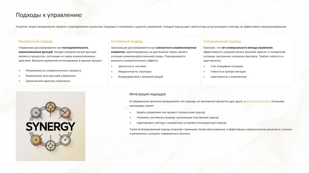 Подходы к управлениюРазвитие теории менеджмента привело к формированию различных подходов к пониманию сущности управления. Каждый подход дает свой взгляд на организацию и методы ее эффективного функционирования.