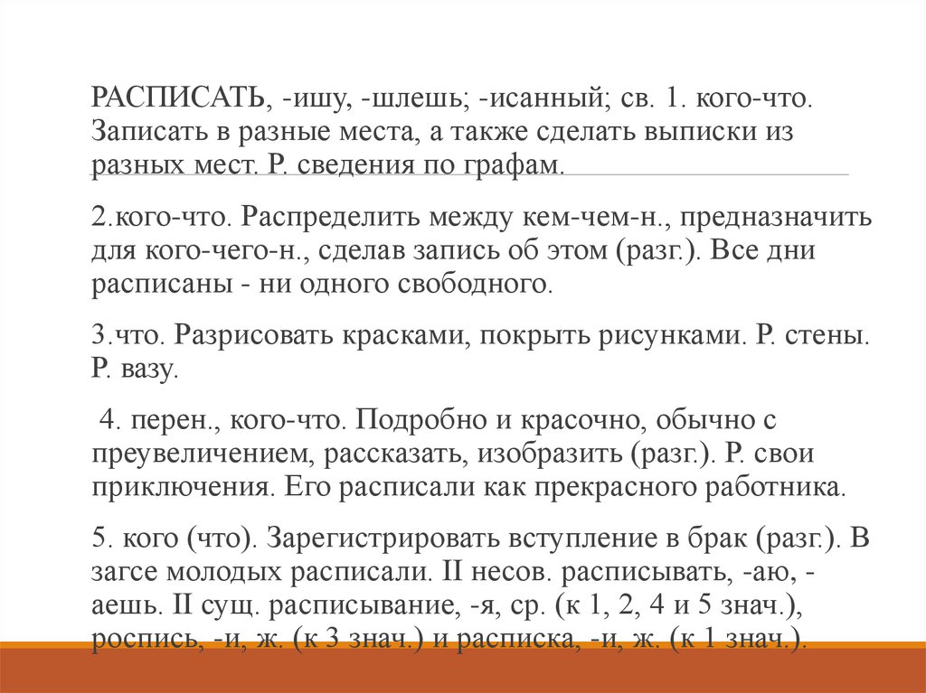 РАСПИСАТЬ, -ишу, -шлешь; -исанный; св. 1. кого-что.Записать в разные места, а также сделать выписки из