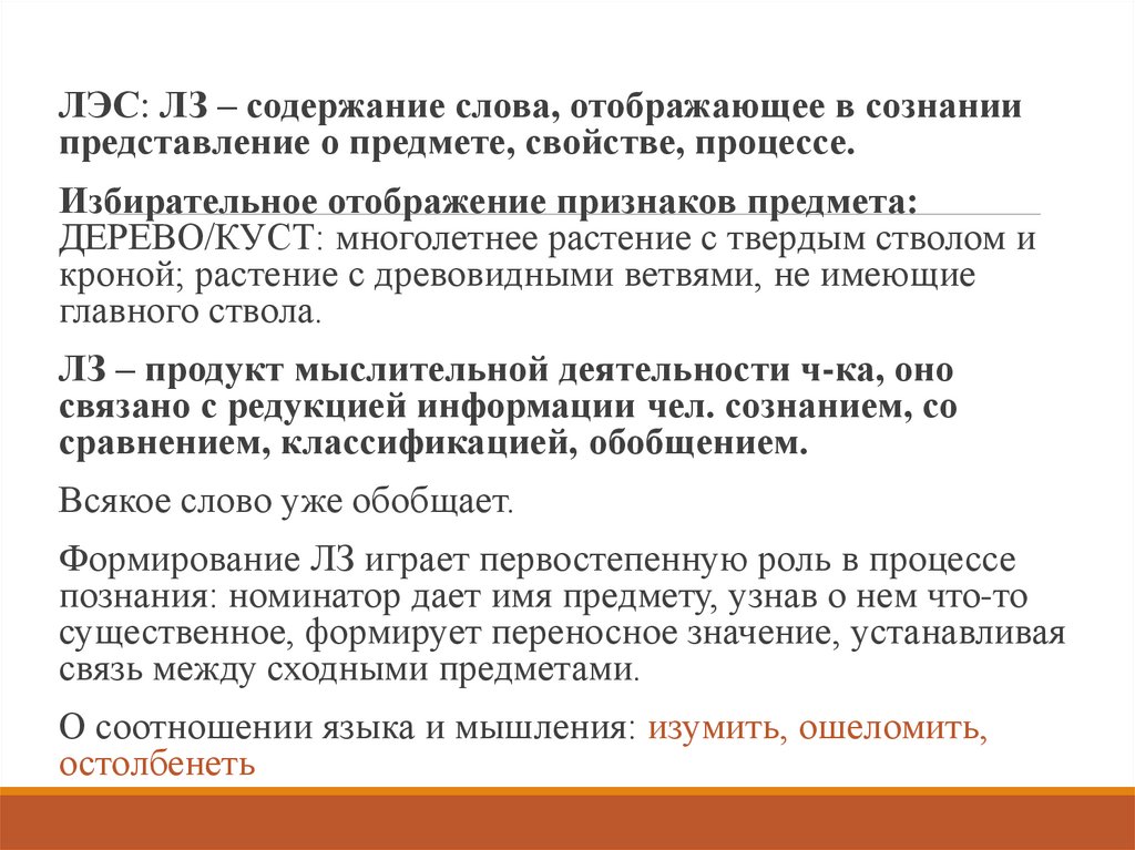 ЛЭС: ЛЗ – содержание слова, отображающее в сознаниипредставление о предмете, свойстве, процессе.