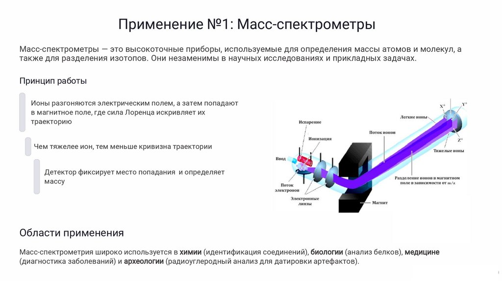 Применение №1: Масс-спектрометрыМасс-спектрометры — это высокоточные приборы, используемые для определения массы атомов и молекул, а
