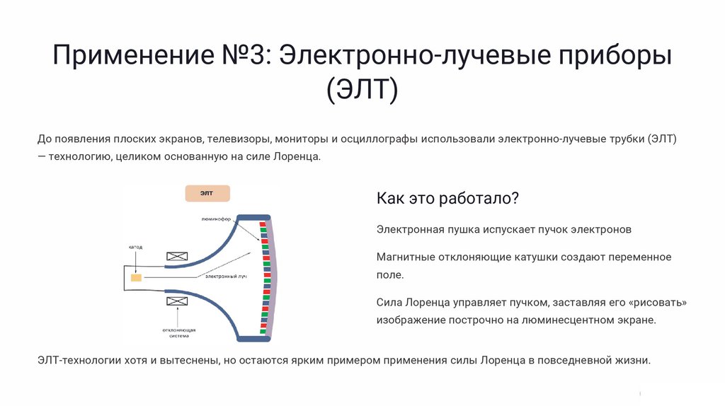 ЭЛТ-технологии хотя и вытеснены, но остаются ярким примером применения силы Лоренца в повседневной жизни.