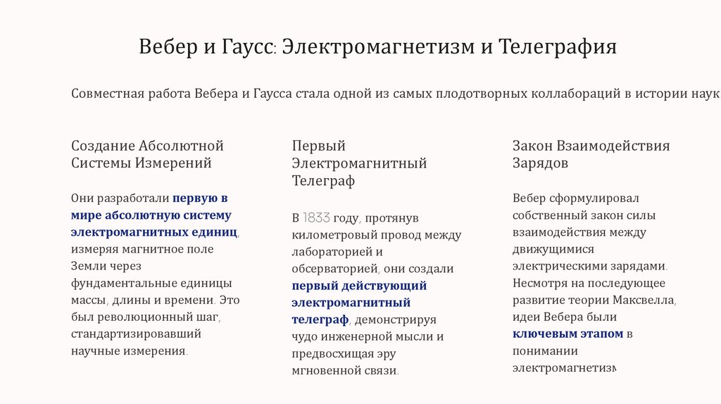 Вебер и Гаусс: Электромагнетизм и ТелеграфияСовместная работа Вебера и Гаусса стала одной из самых плодотворных коллабораций в истории науки