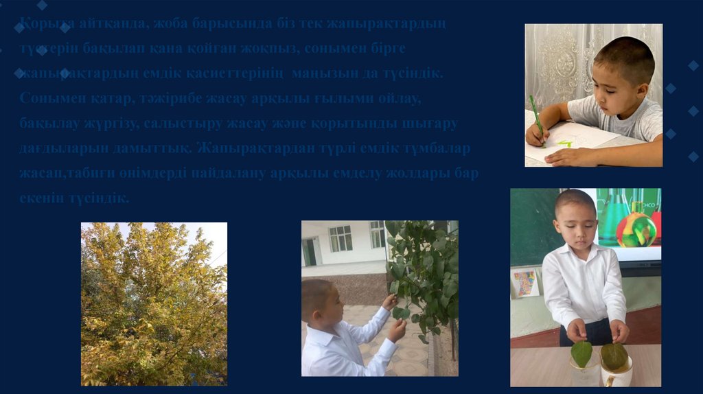 Қорыта айтқанда, жоба барысында біз тек жапырақтардыңтүстерін бақылап қана қойған жоқпыз, сонымен бірге