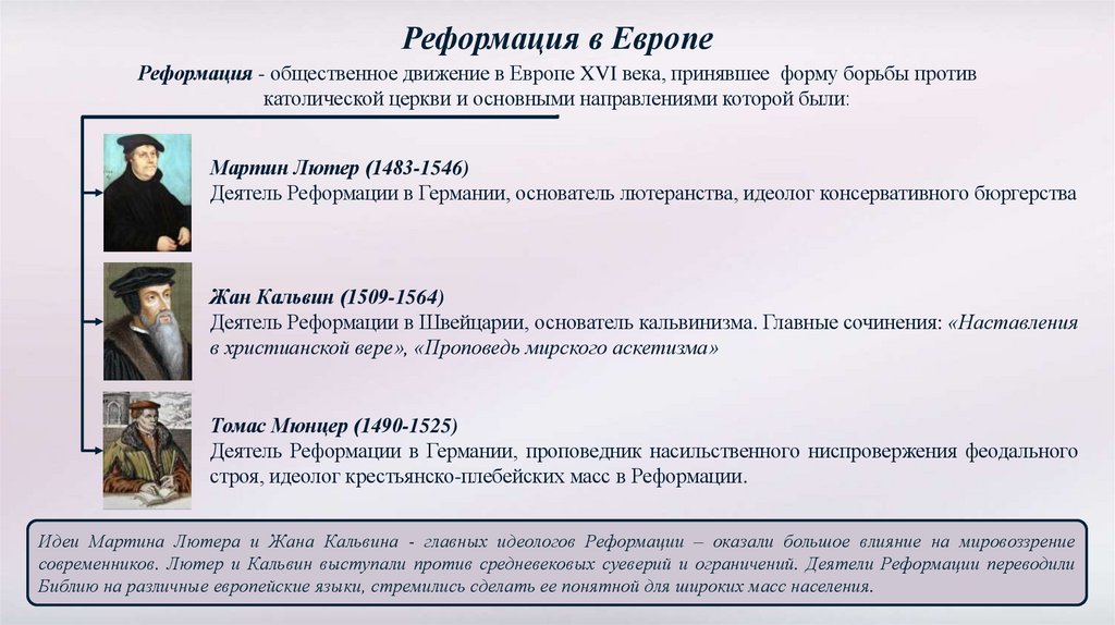 Идеи Мартина Лютера и Жана Кальвина - главных идеологов Реформации – оказали большое влияние на мировоззрение