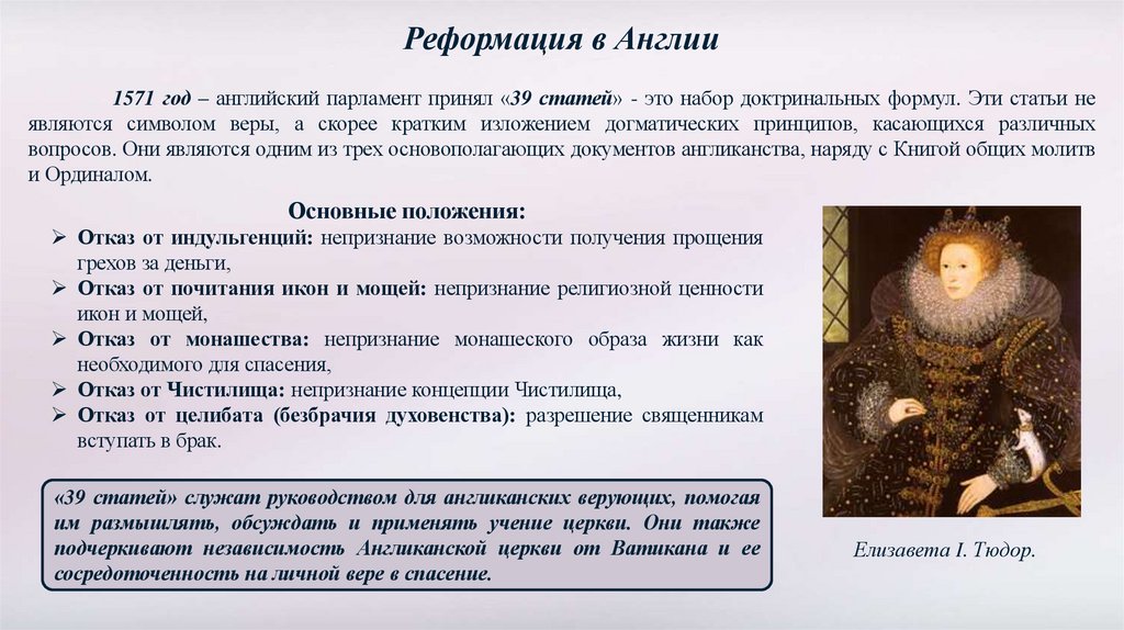 Реформация в Англии1571 год – английский парламент принял «39 статей» - это набор доктринальных формул. Эти статьи не