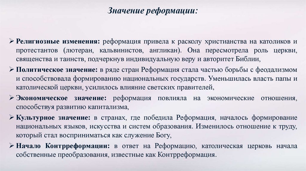 Значение реформации:Религиозные изменения: реформация привела к расколу христианства на католиков и