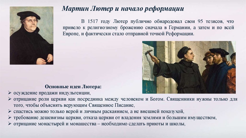 Мартин Лютер и начало реформацииВ 1517 году Лютер публично обнародовал свои 95 тезисов, что