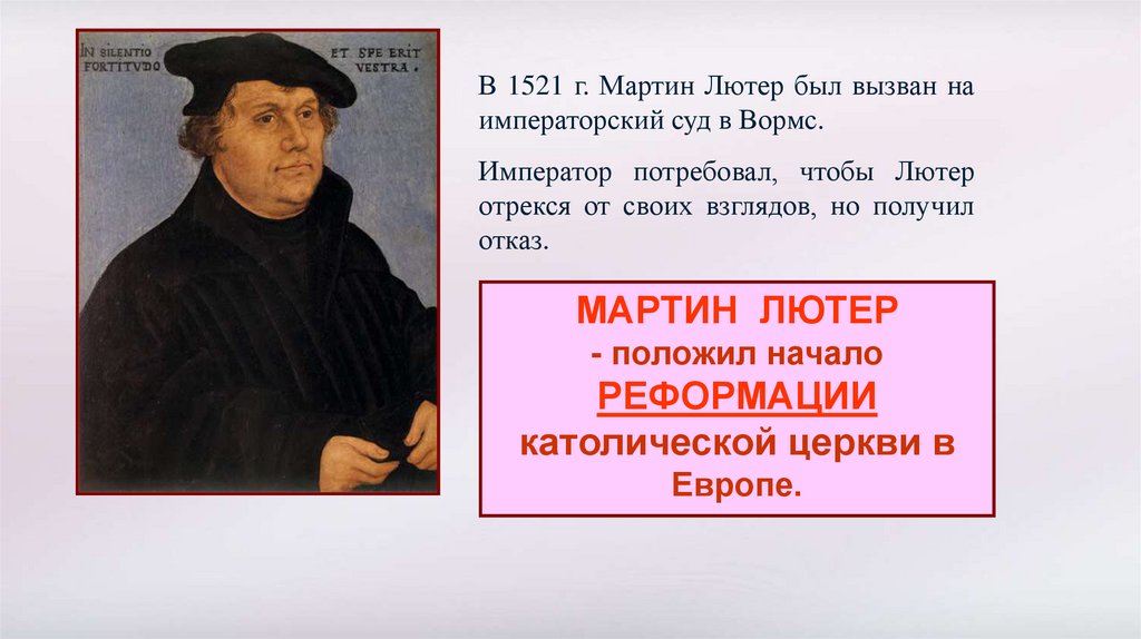 В 1521 г. Мартин Лютер был вызван наимператорский суд в Вормс.