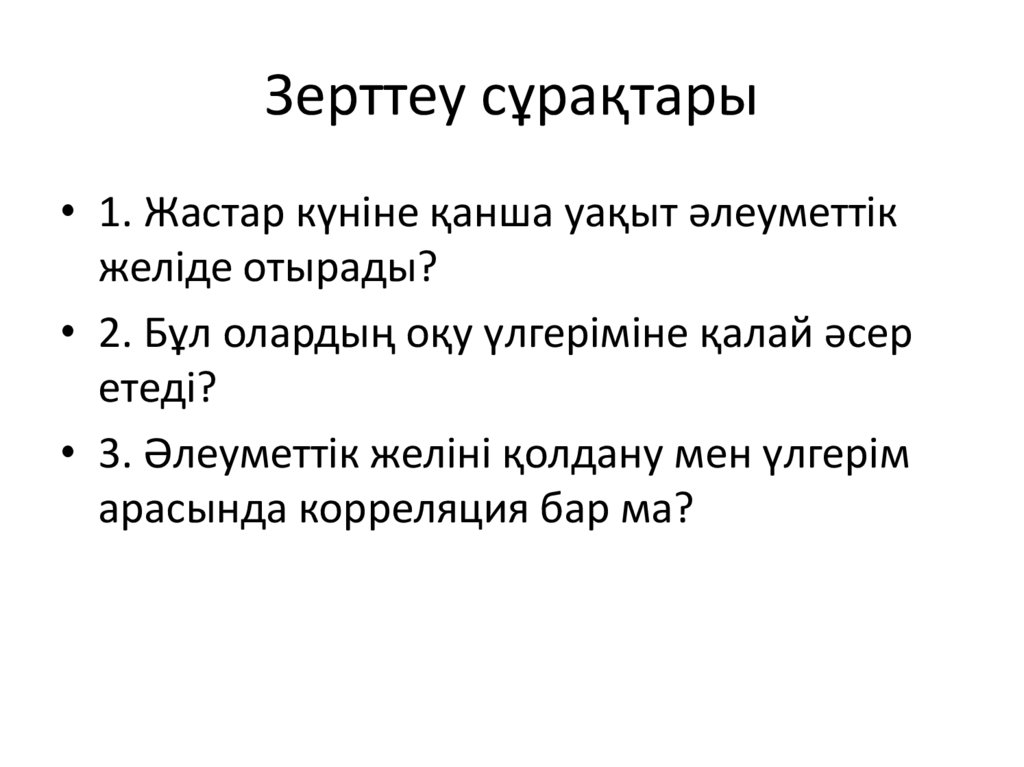 Зерттеу сұрақтары• 1. Жастар күніне қанша уақыт әлеуметтік