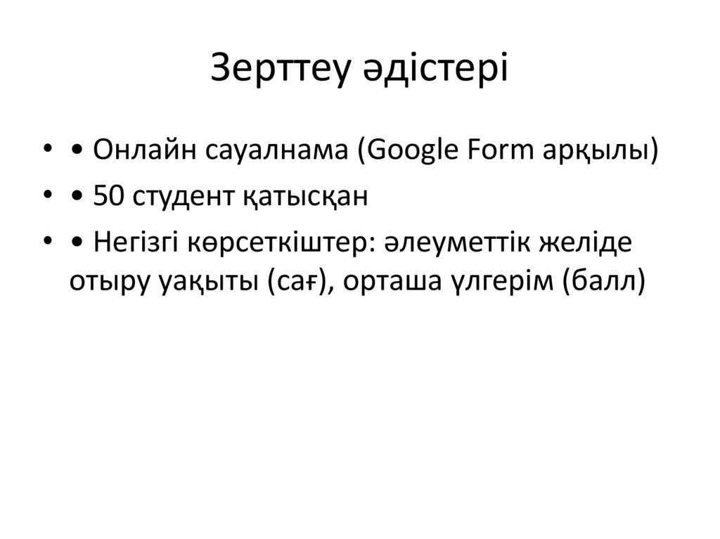 Зерттеу әдістері• • Онлайн сауалнама (Google Form арқылы)