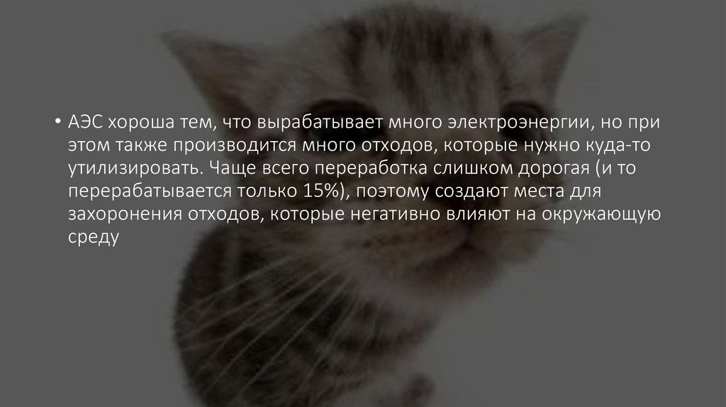 • АЭС хороша тем, что вырабатывает много электроэнергии, но приэтом также производится много отходов, которые нужно куда-то