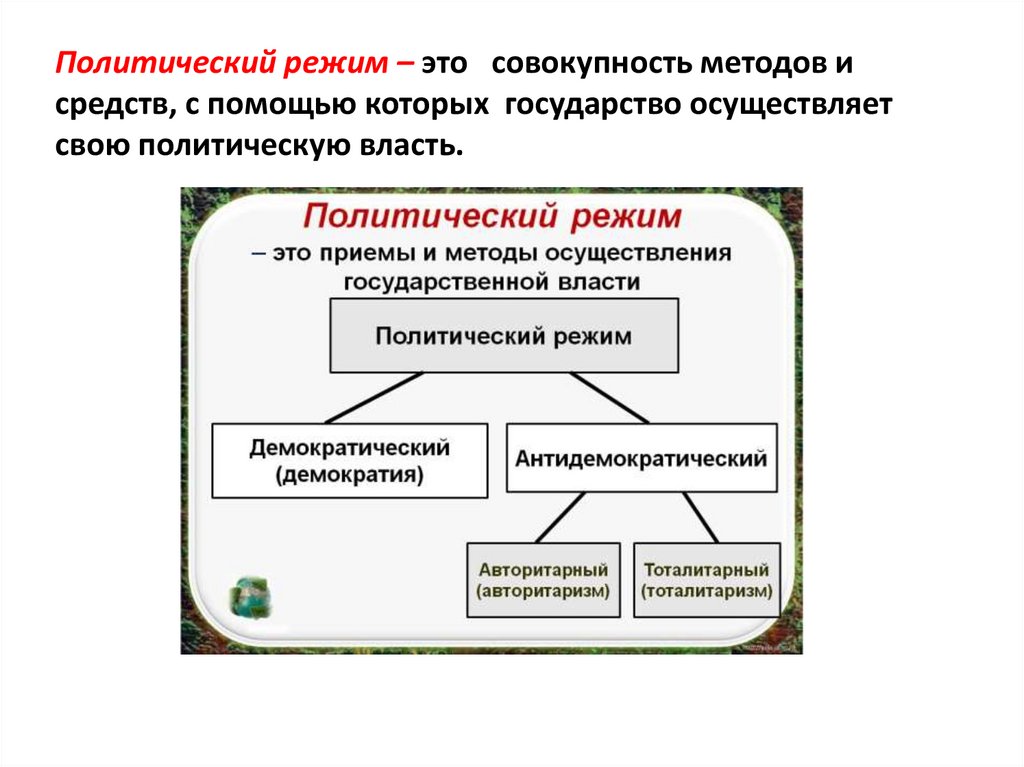 Политический режим – это совокупность методов исредств, с помощью которых государство осуществляет