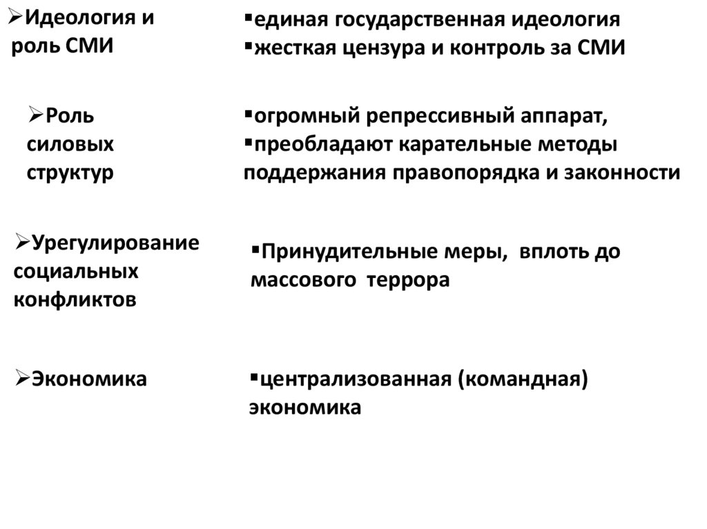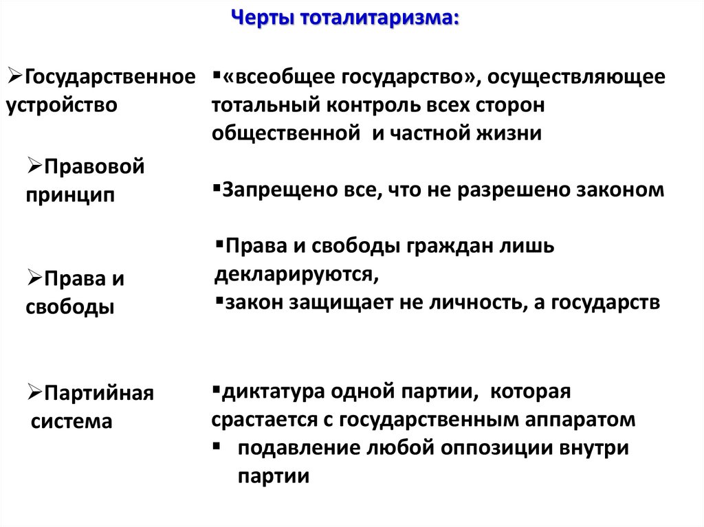 Черты тоталитаризма:Государственное «всеобщее государство», осуществляющее