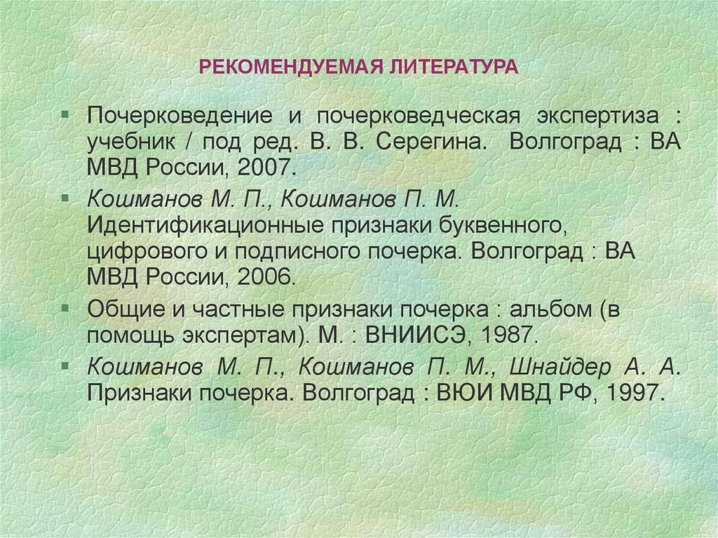РЕКОМЕНДУЕМАЯ ЛИТЕРАТУРАПочерковедение и почерковедческая экспертиза :