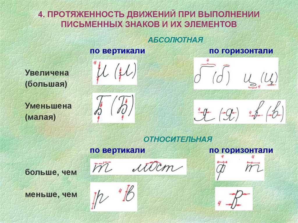 4. ПРОТЯЖЕННОСТЬ ДВИЖЕНИЙ ПРИ ВЫПОЛНЕНИИПИСЬМЕННЫХ ЗНАКОВ И ИХ ЭЛЕМЕНТОВ