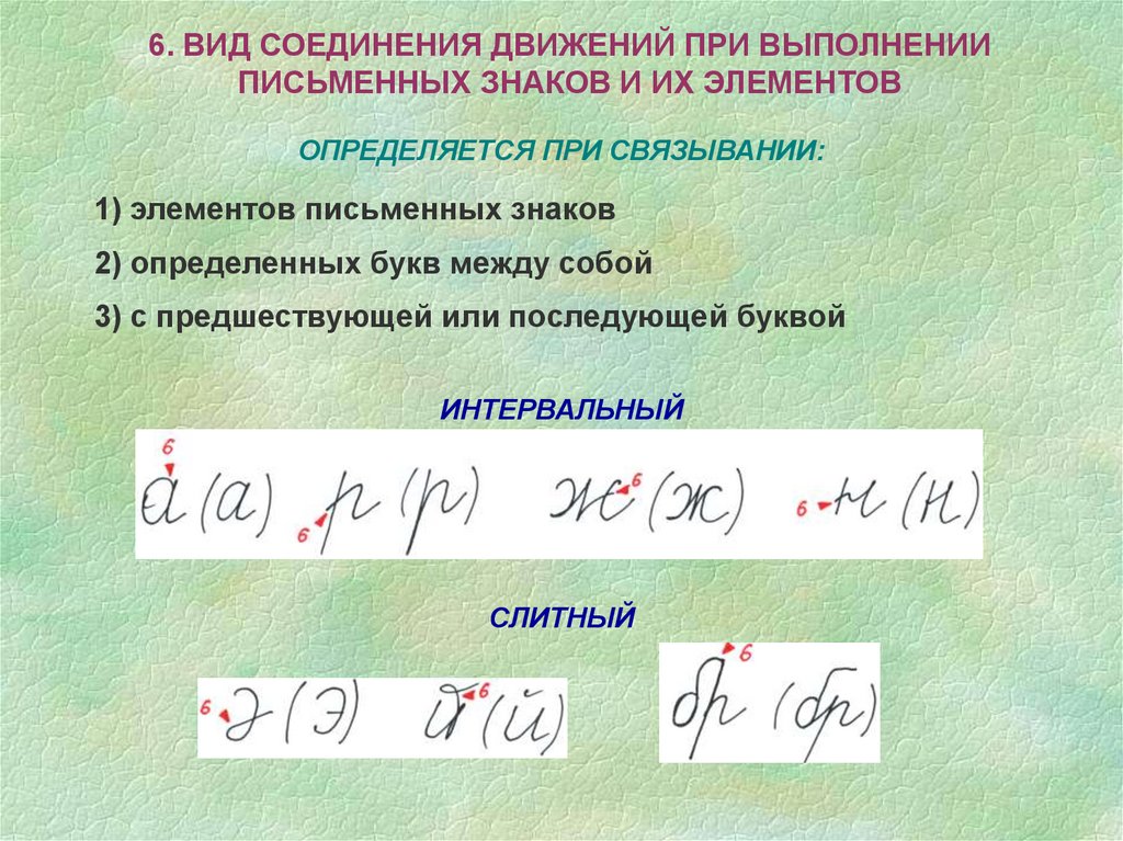 6. ВИД СОЕДИНЕНИЯ ДВИЖЕНИЙ ПРИ ВЫПОЛНЕНИИПИСЬМЕННЫХ ЗНАКОВ И ИХ ЭЛЕМЕНТОВ