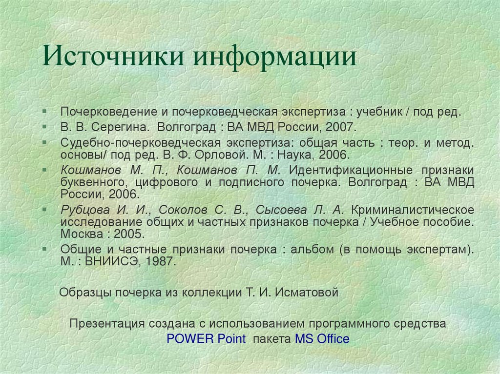 Источники информацииПочерковедение и почерковедческая экспертиза : учебник / под ред.