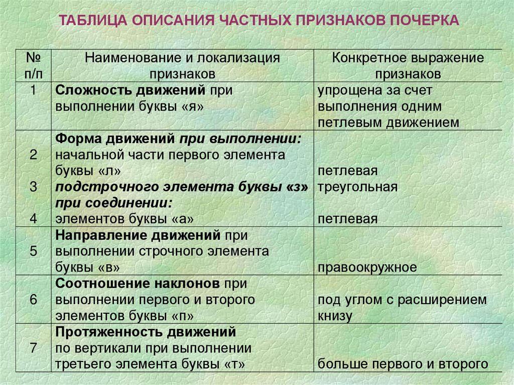 ТАБЛИЦА ОПИСАНИЯ ЧАСТНЫХ ПРИЗНАКОВ ПОЧЕРКА№