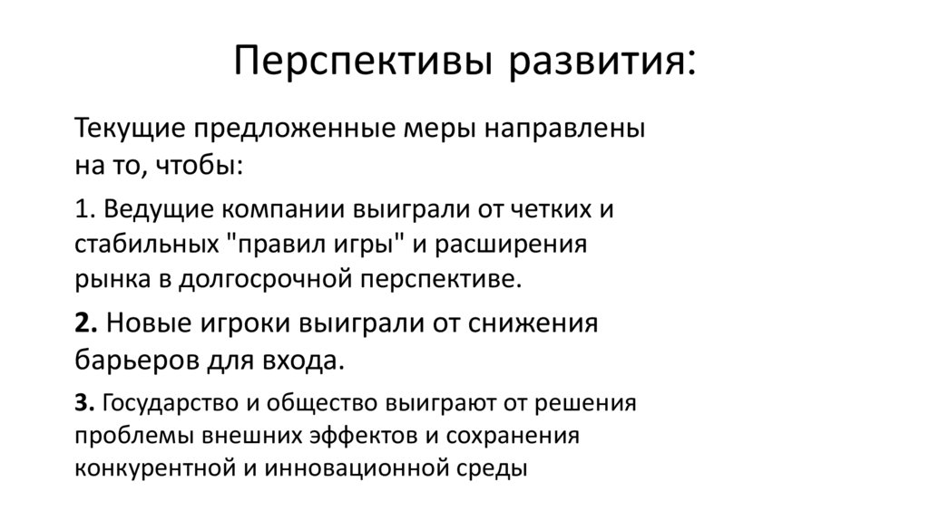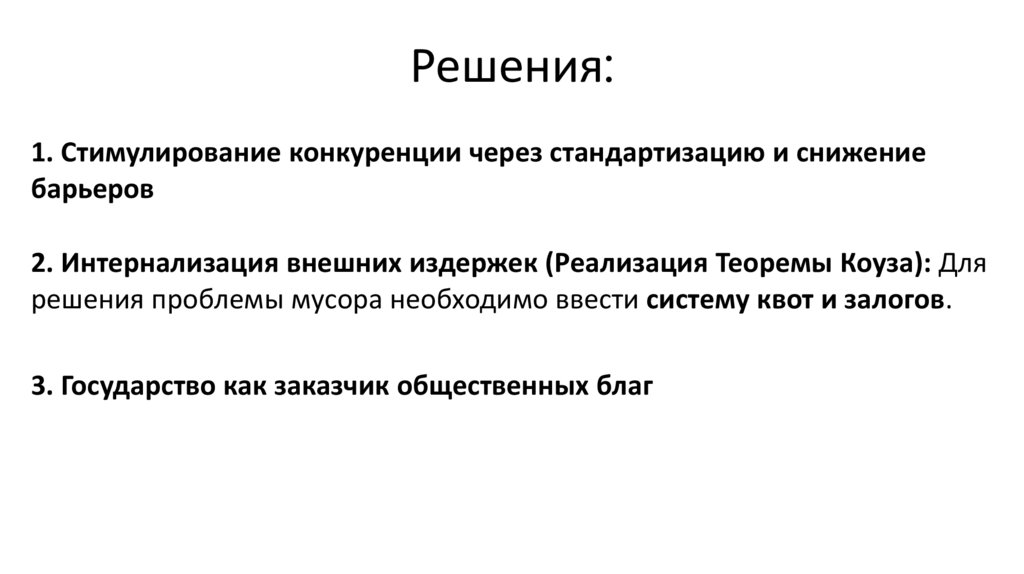Решения:1. Стимулирование конкуренции через стандартизацию и снижение