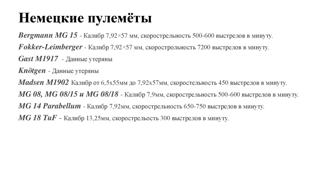 MG 08, MG 08/15 и MG 08/18 - Калибр 7,9мм, скорострельность 500-600 выстрелов в минуту.