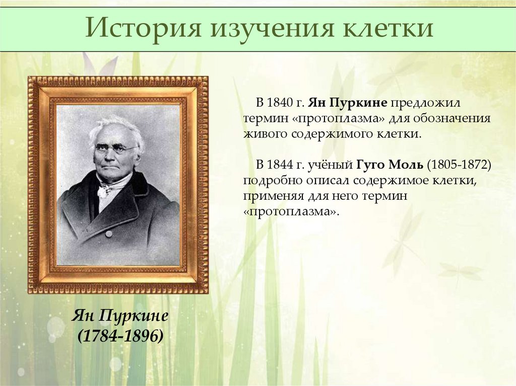 История изучения клеткиВ 1840 г. Ян Пуркине предложил