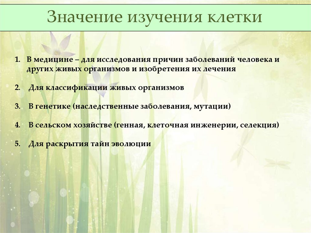 Значение изучения клетки1. В медицине – для исследования причин заболеваний человека и