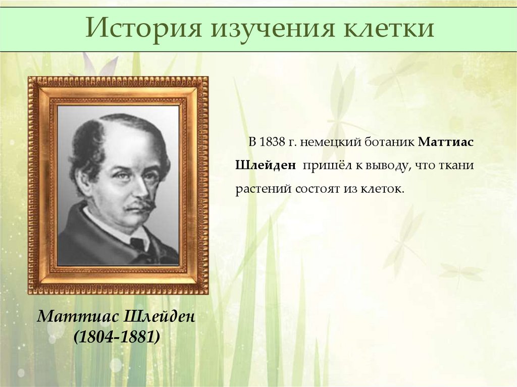 История изучения клеткиВ 1838 г. немецкий ботаник Маттиас