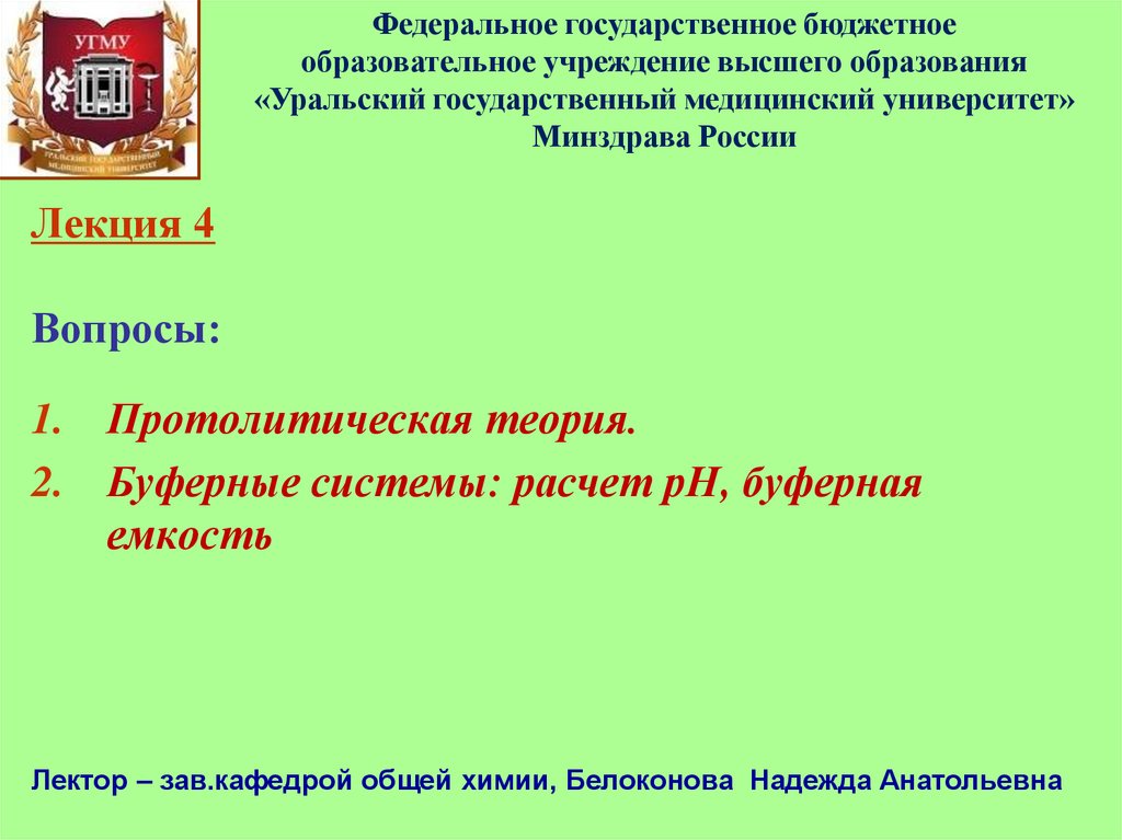 Лектор – зав.кафедрой общей химии, Белоконова Надежда Анатольевна