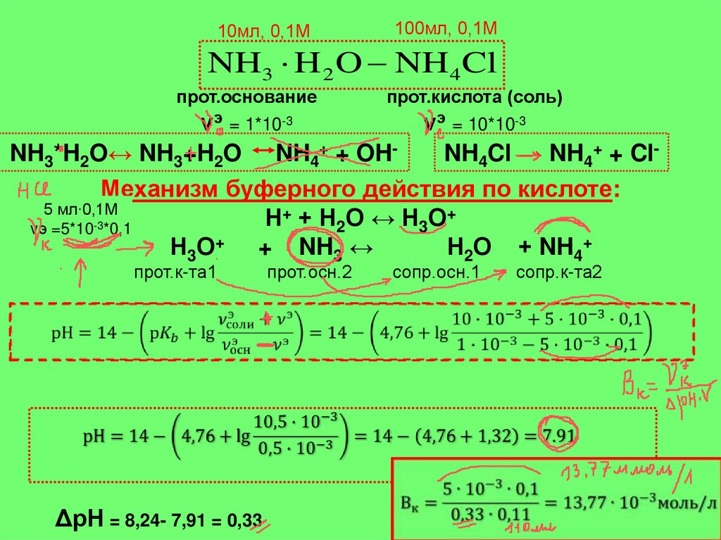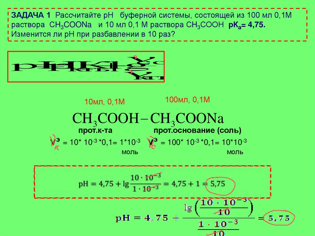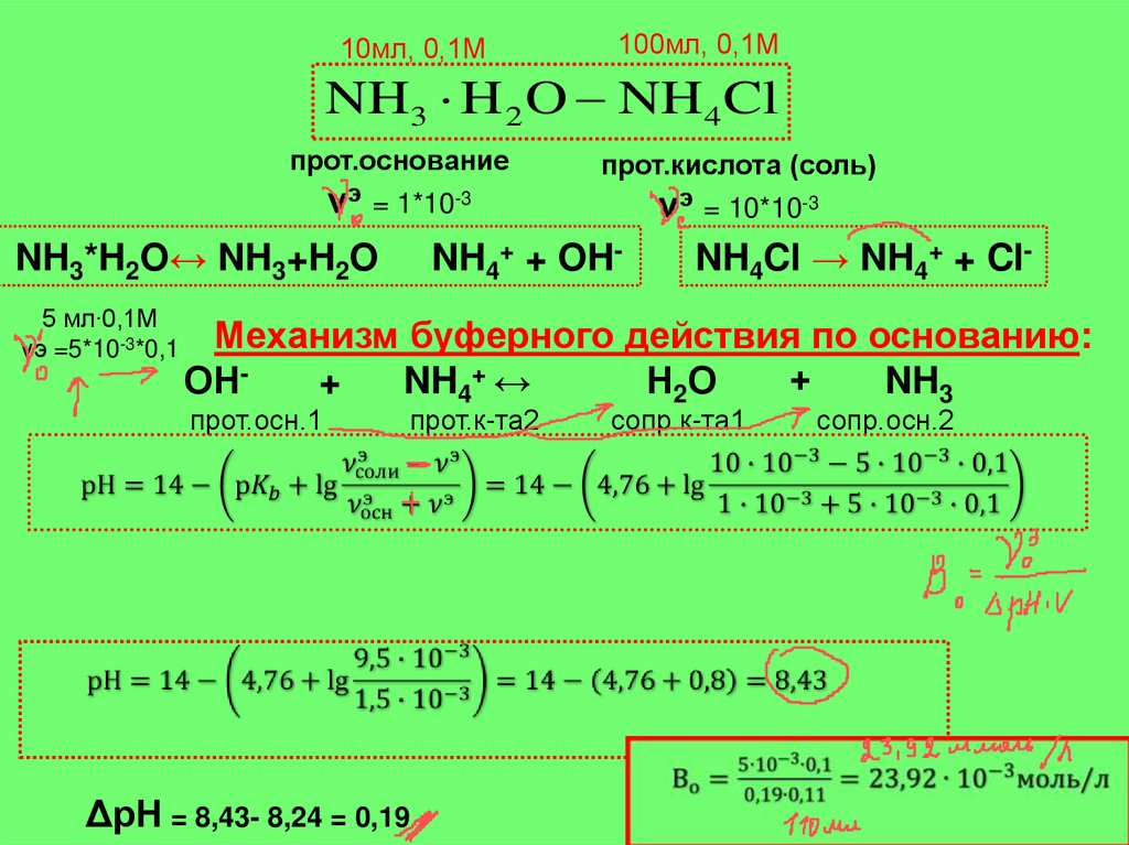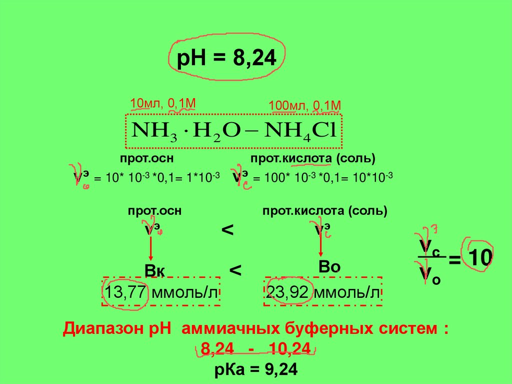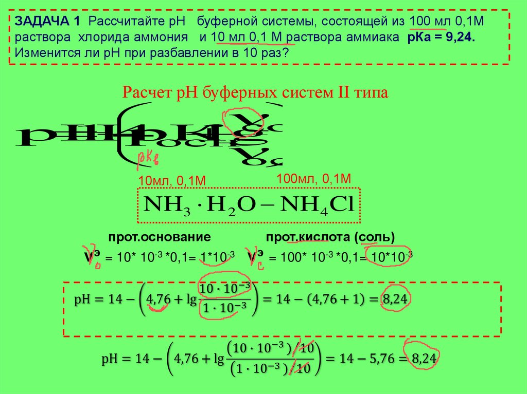 ЗАДАЧА 1 Рассчитайте рН буферной системы, состоящей из 100 мл 0,1Мраствора хлорида аммония и 10 мл 0,1 М раствора аммиака рКа = 9,24.
