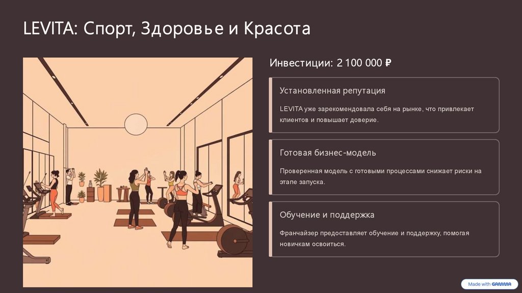 LEVITA: Спорт, Здоров ь е и КрасотаИнвестиции: 2 1 00 000 ₽