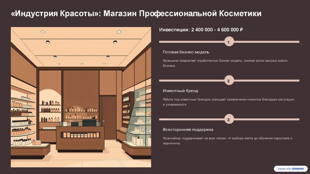 «Индустрия Красоты»: Магазин Профессиональной КосметикиИнвестиции: 2 400 000 - 4 600 000 ₽