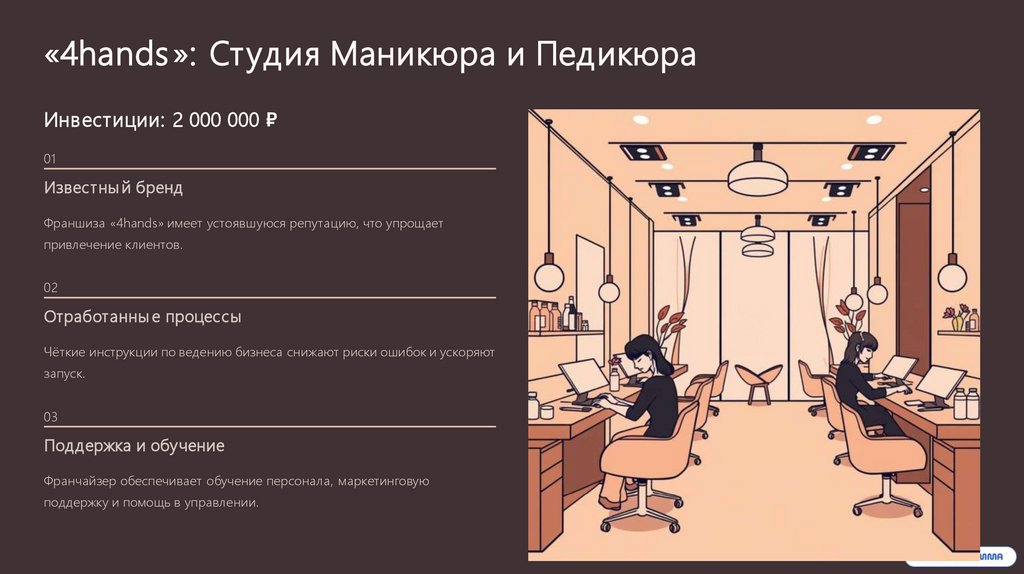 «4hands »: Ст удия Маникюра и ПедикюраИнвестиции: 2 000 000 ₽