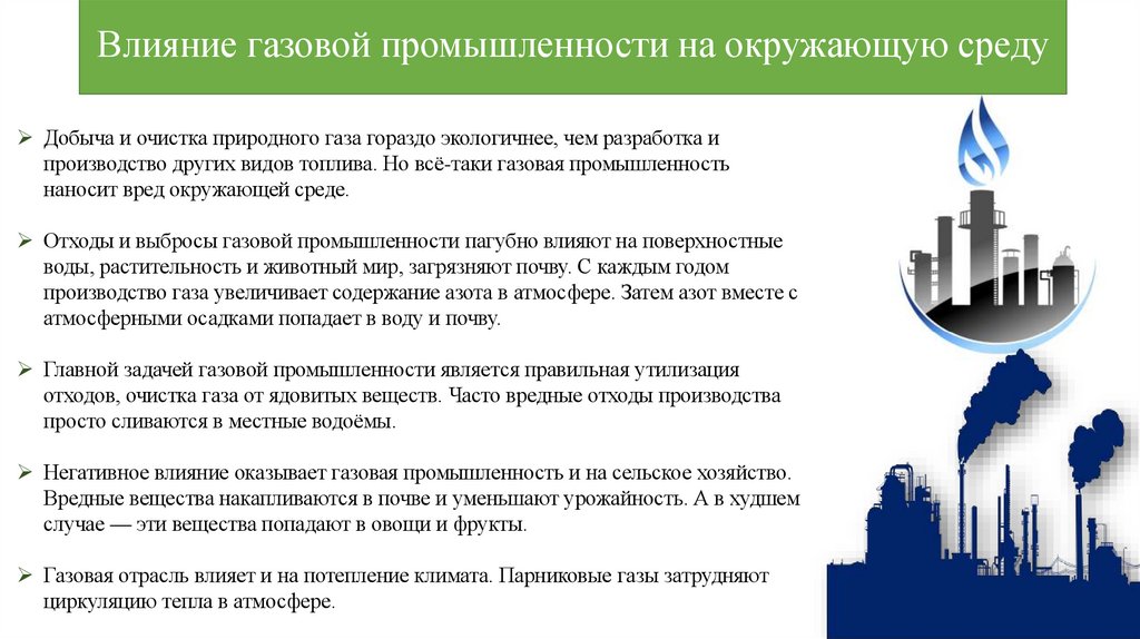 Влияние газовой промышленности на окружающую средуДобыча и очистка природного газа гораздо экологичнее, чем разработка и