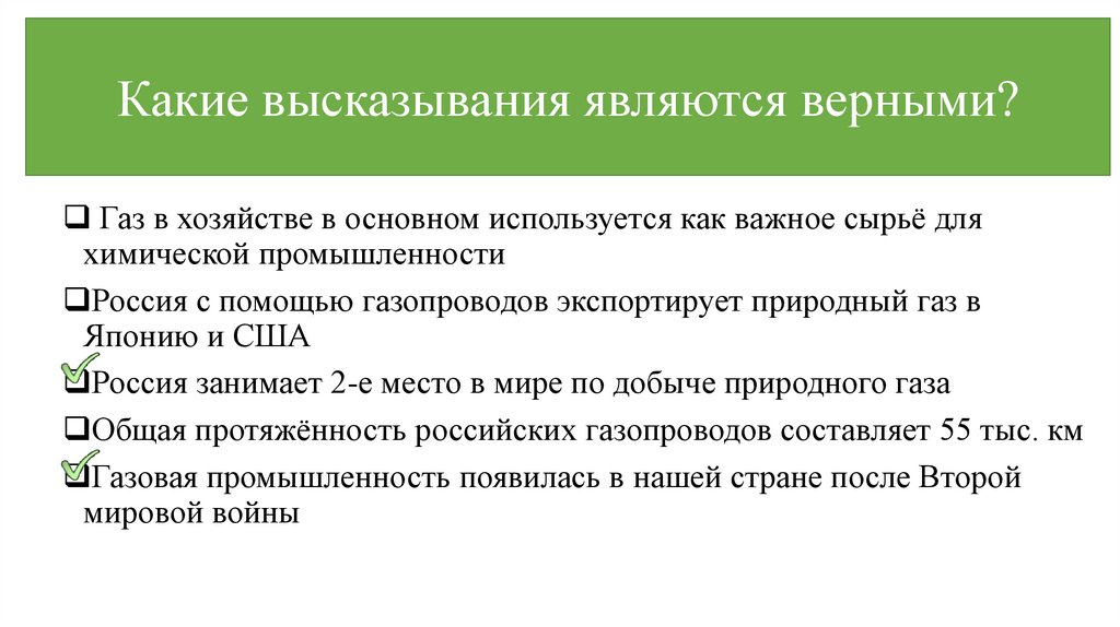 Какие высказывания являются верными?Газ в хозяйстве в основном используется как важное сырьё для