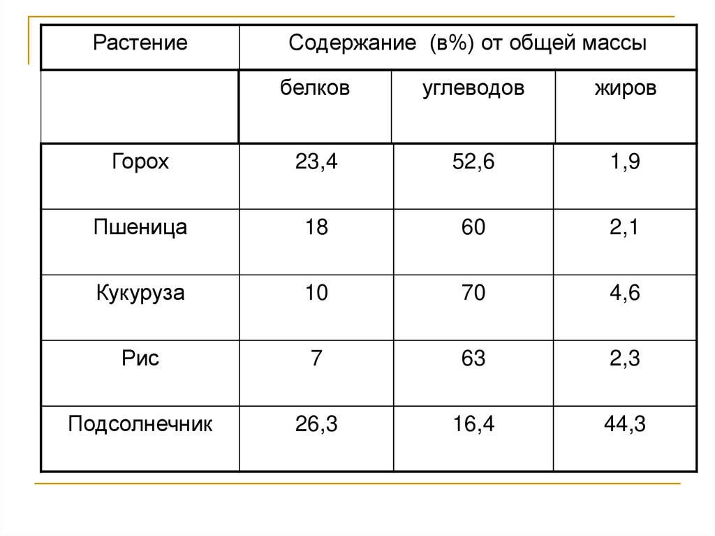 РастениеСодержание (в%) от общей массы