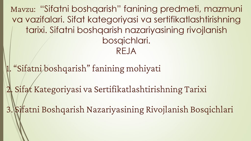 Mavzu: “Sifatni boshqarish” fanining predmeti, mazmuniva vazifalari. Sifat kategoriyasi va sertifikatlashtirishning