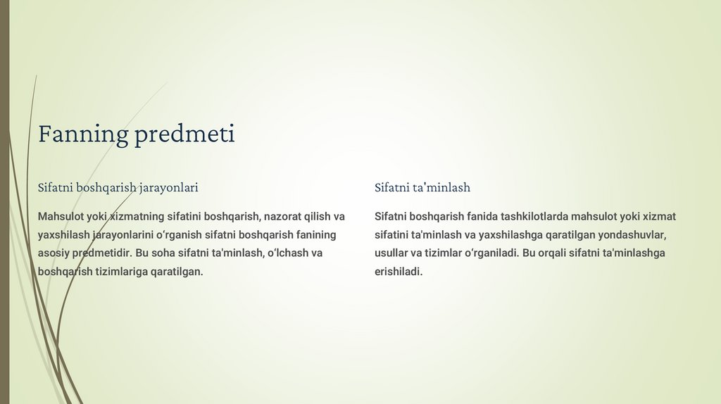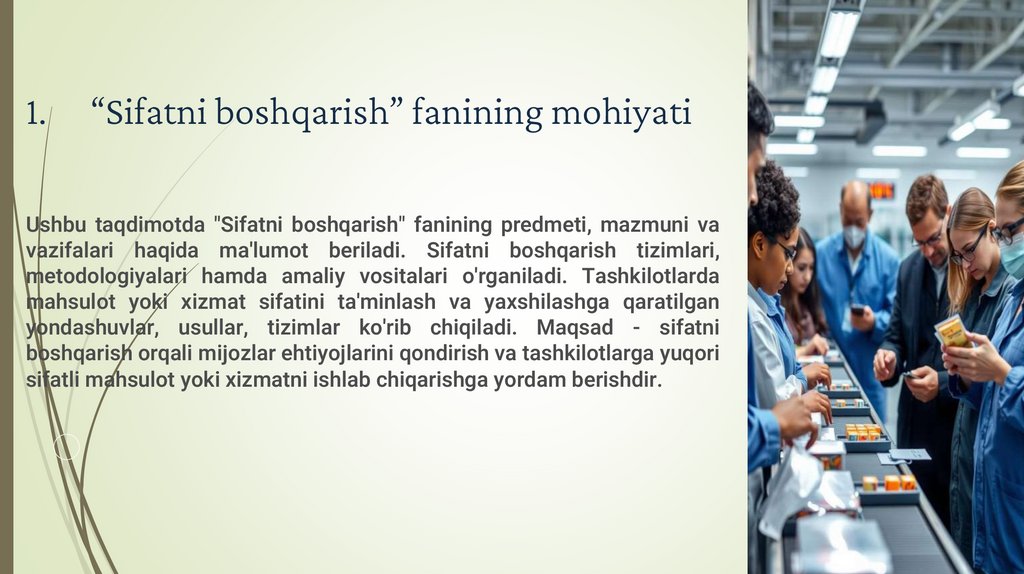 Ushbu taqdimotda "Sifatni boshqarish" fanining predmeti, mazmuni va