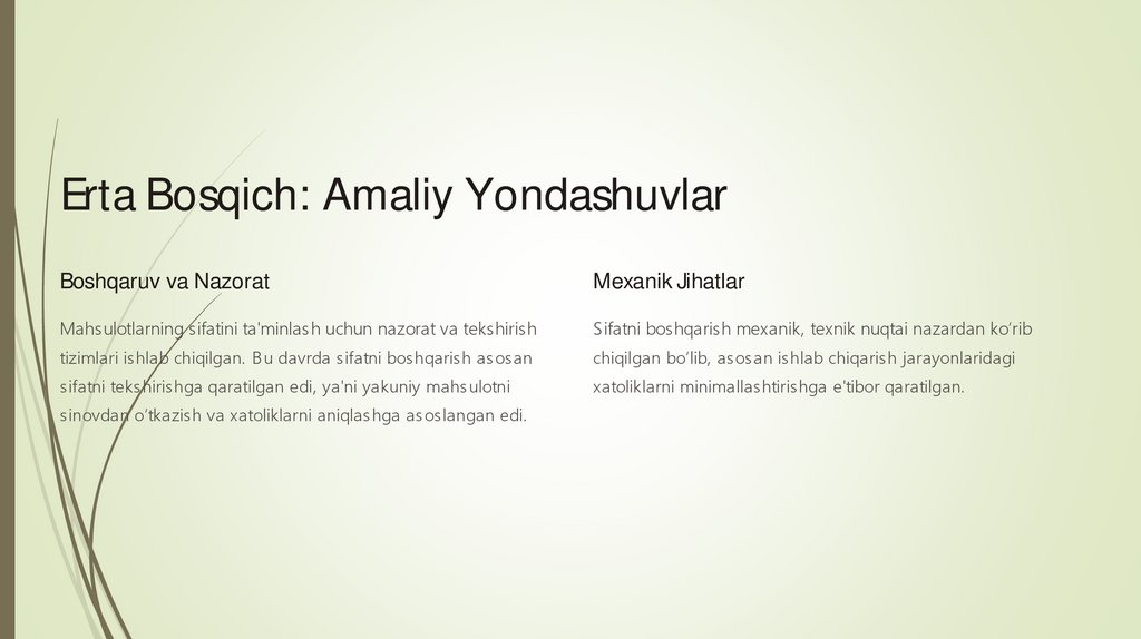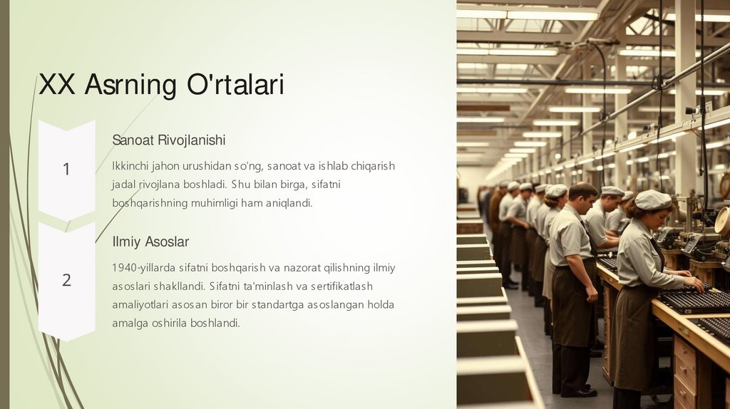 tizimlari ishlab chiqilgan. Bu davrda sifatni boshqarish asosan