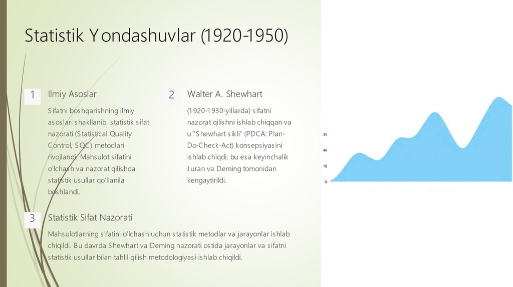 chiqildi. Bu davrda S hewhart va Deming nazorati ostida jarayonlar va sifatni