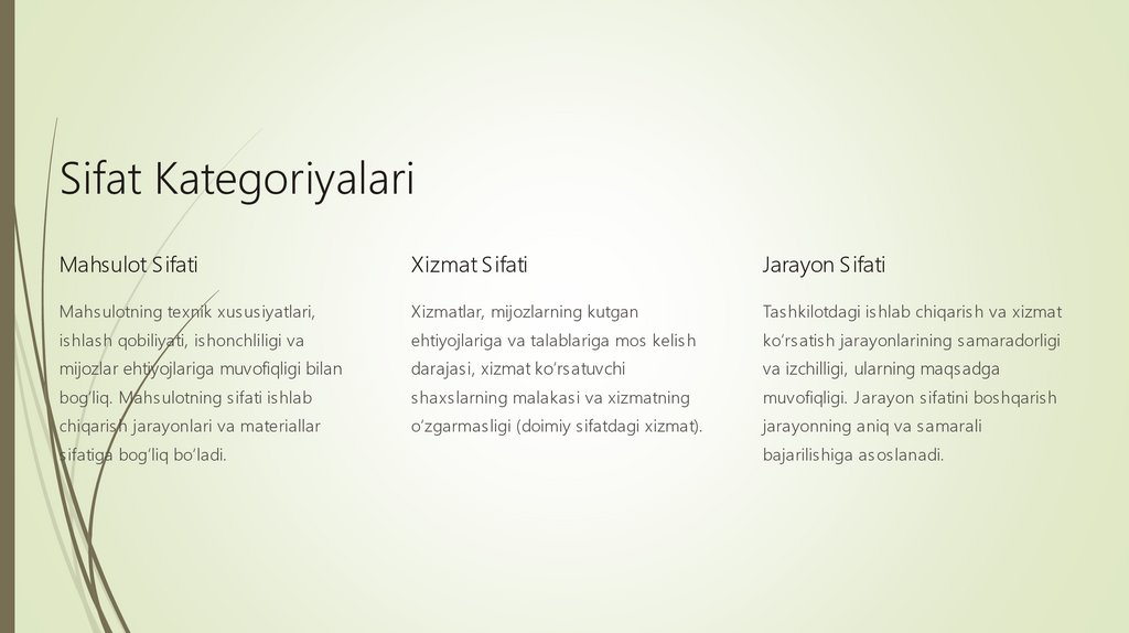 yondashuvlar, usullar, tizimlar ko'rib chiqiladi. Maqsad - sifatni